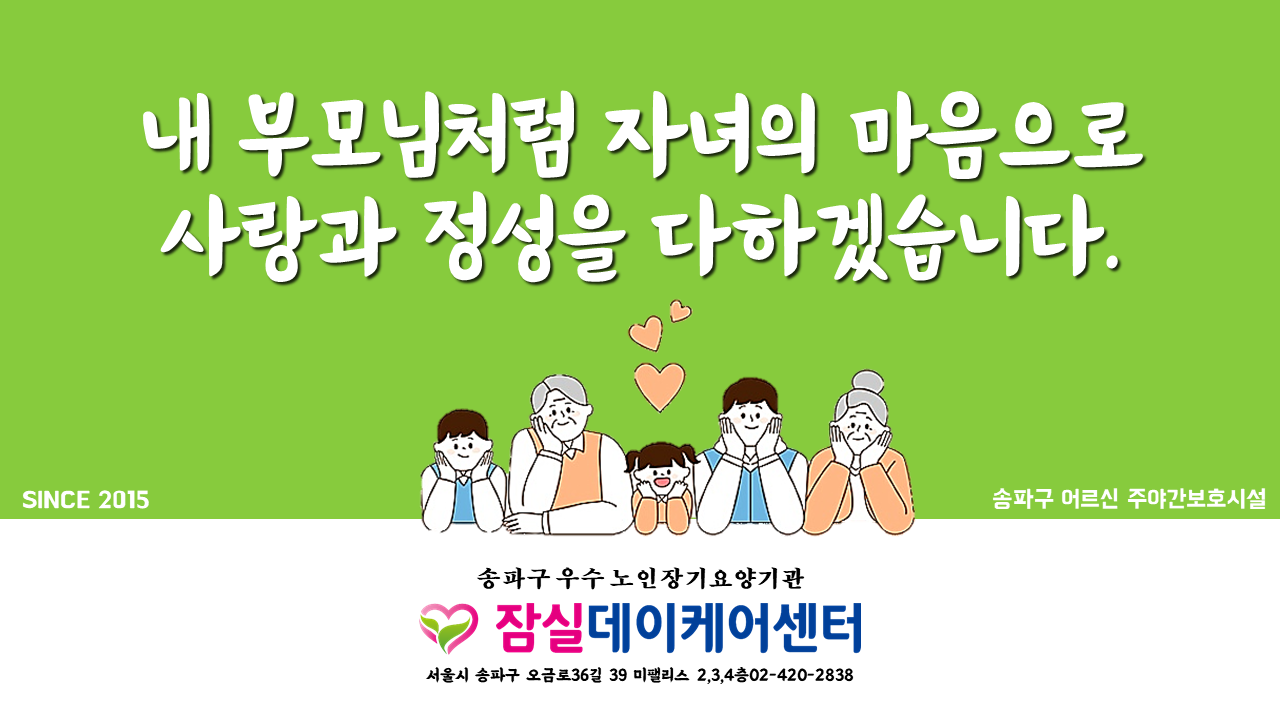 잠실데이케어센터 네이버 블로그를 통해 잠실데이케어센터의 일상을 확인하실 수 있습니다. 많은 이용 바랍니다. 감사합니다. ![]() |